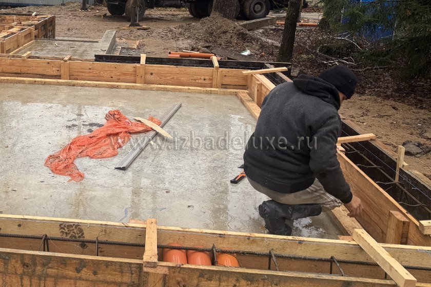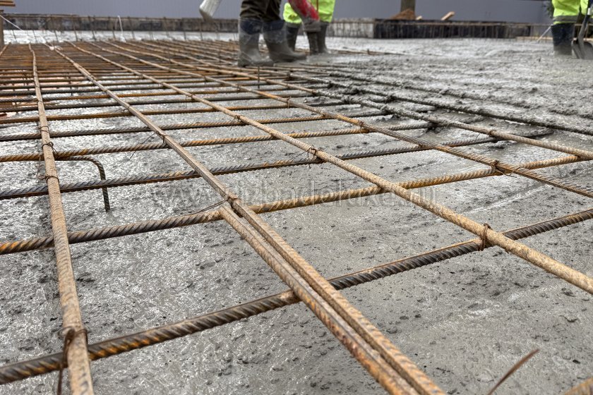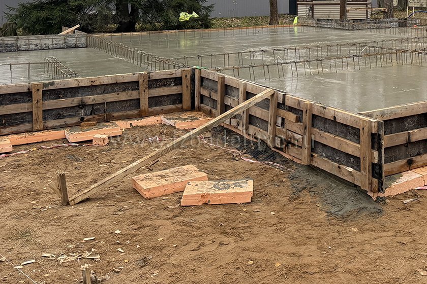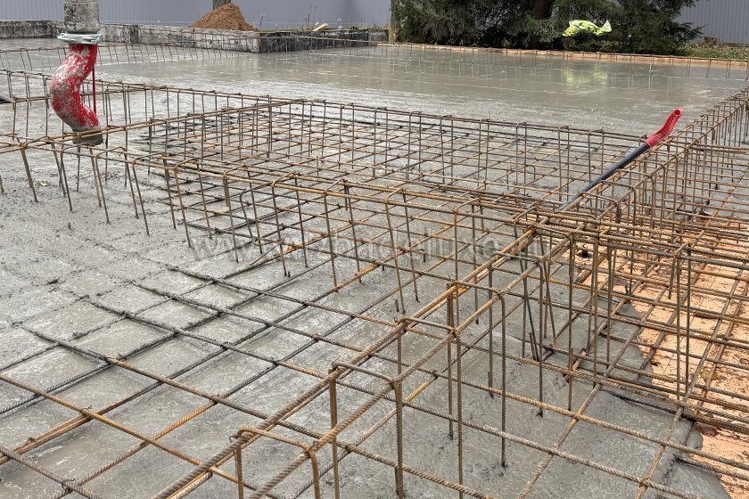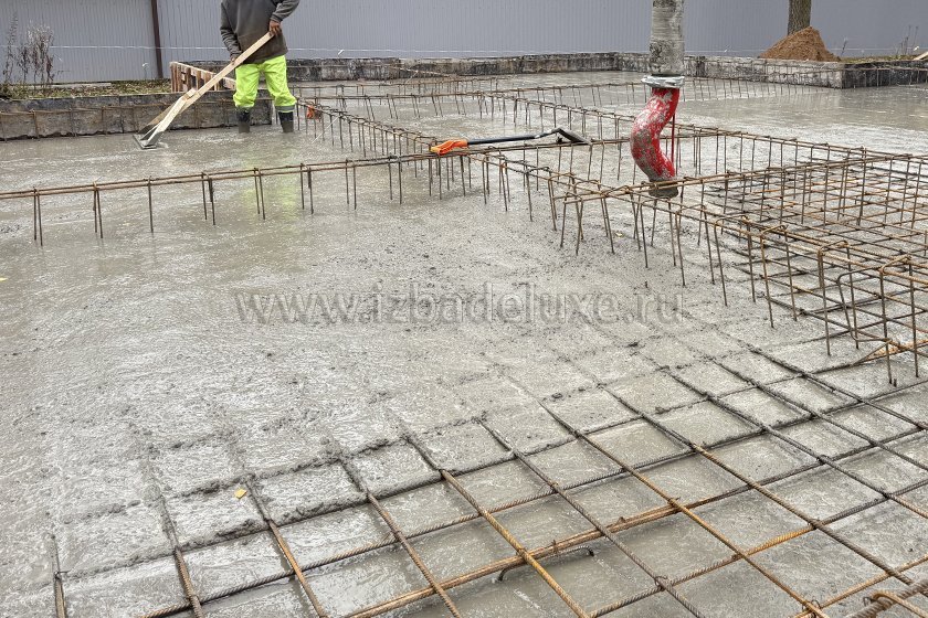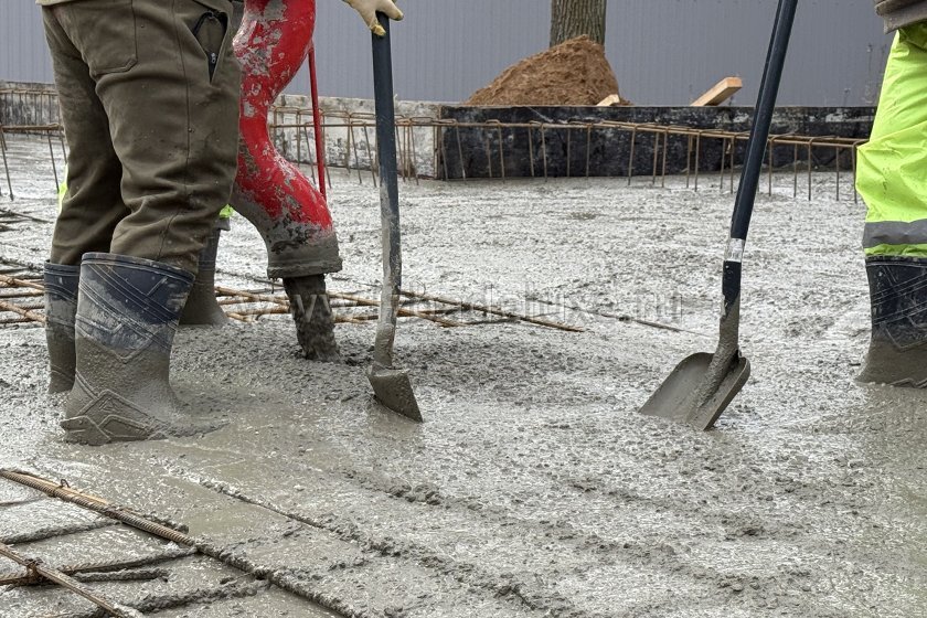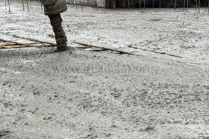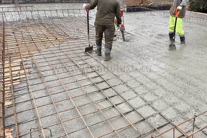На объекте выполняется укладка бетонной смеси в конструкцию фундаментной плиты.