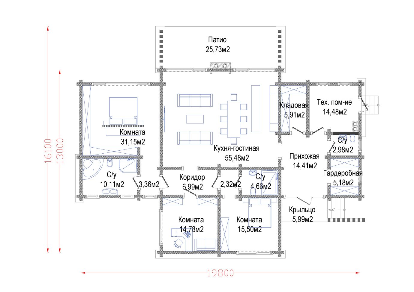 «Коттедж в Химках» – одноэтажный дом с патио, общей площадью 219,03 кв.м. Сердце дома - просторная кухня-гостиная. Габаритные размеры дома 16,1 м. х 19,8 м.