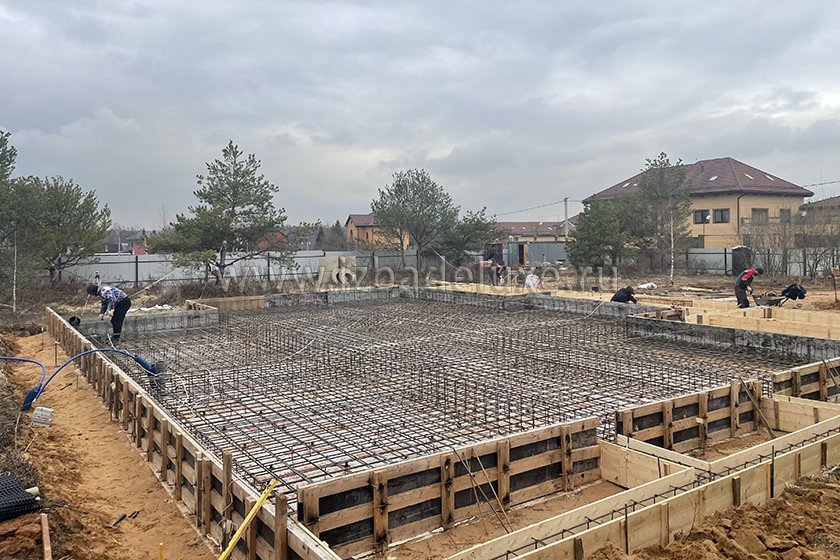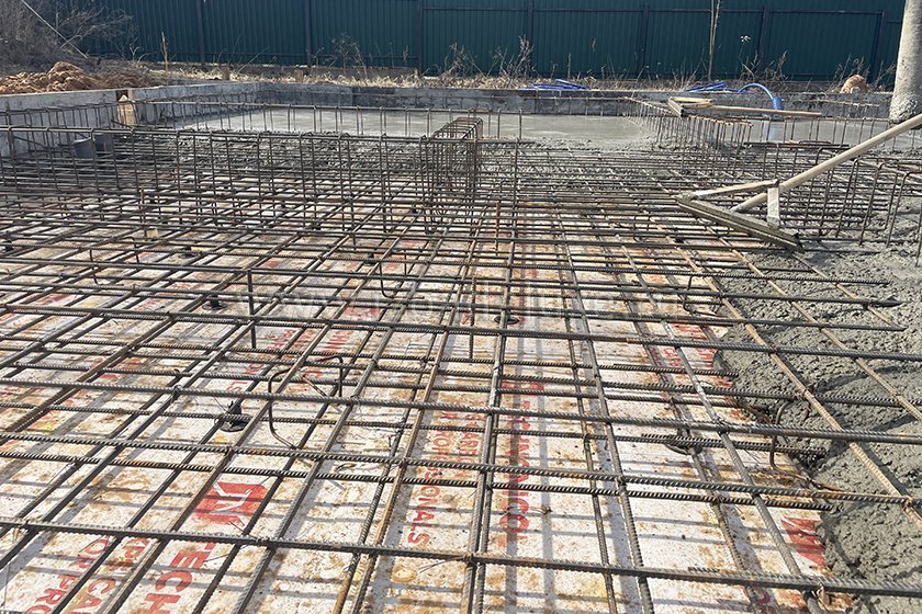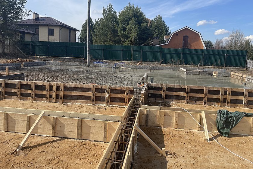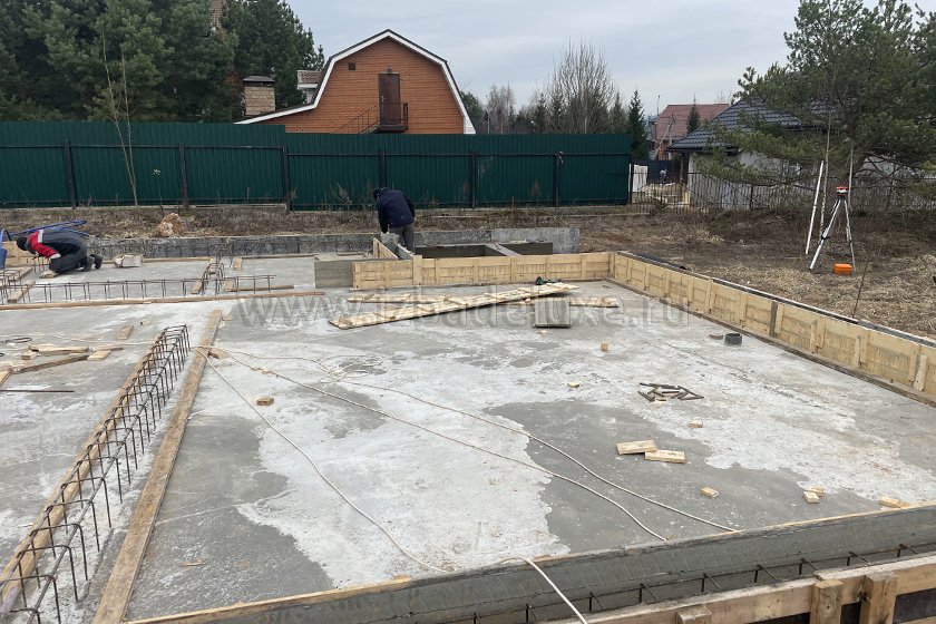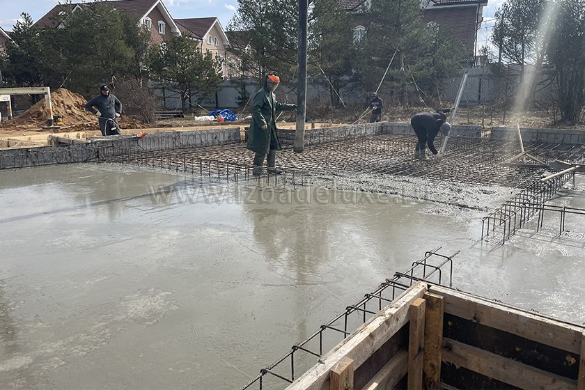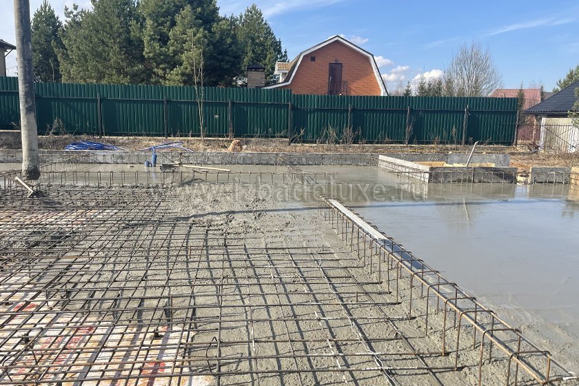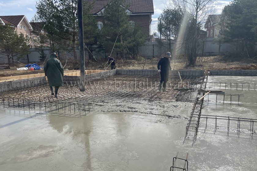 На объекте выполнили заливку бетоном плиты фундамента.