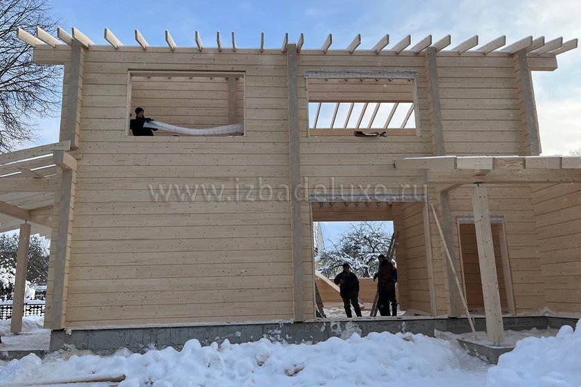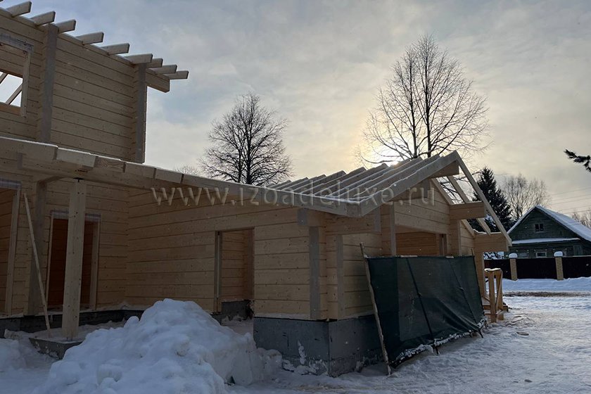 На объекте выполнили сборку стен домокомплекта. Выполнили сборка стропильной системы. Выполняется установка обсады.
