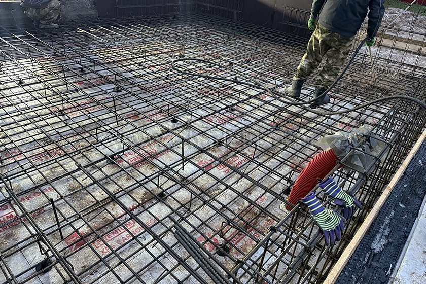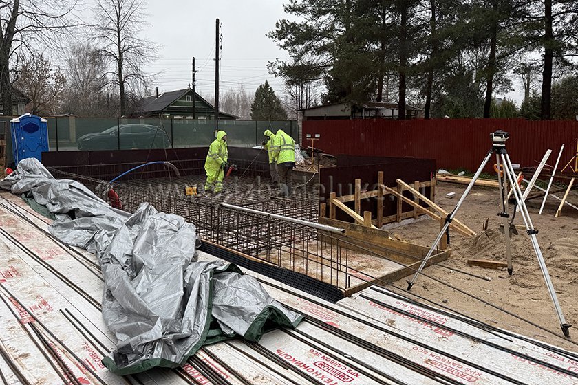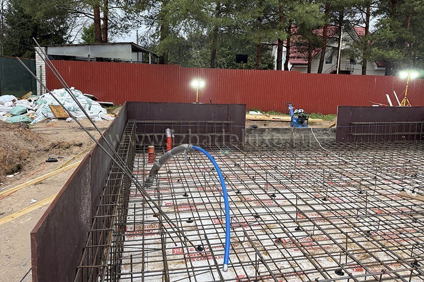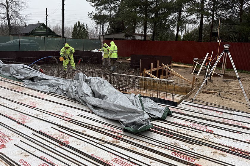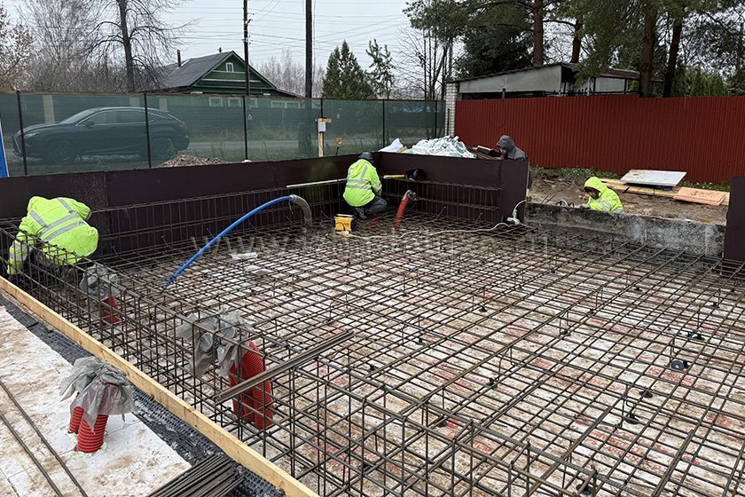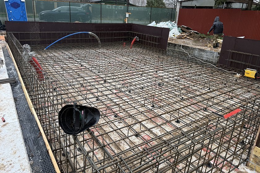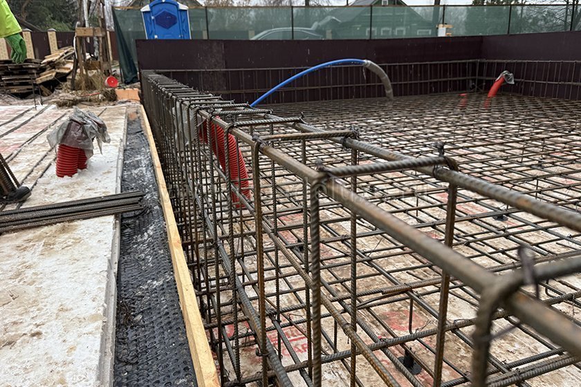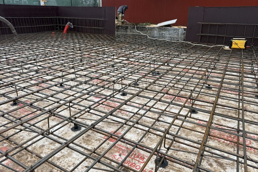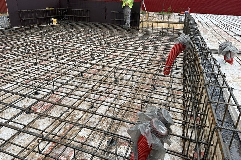 На объекте выполняются работы по армированию плиты фундамента.