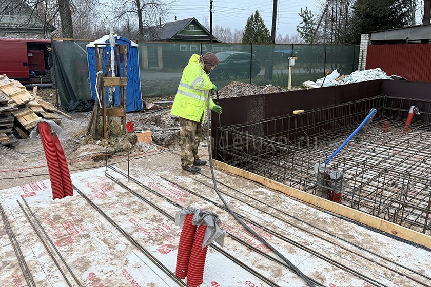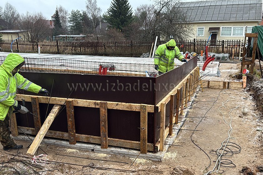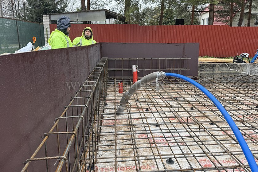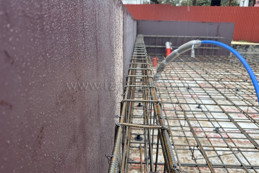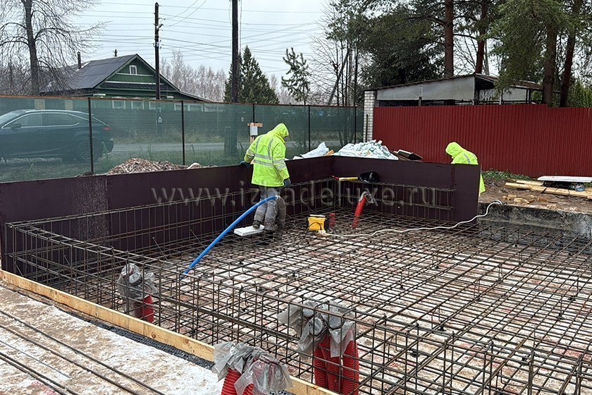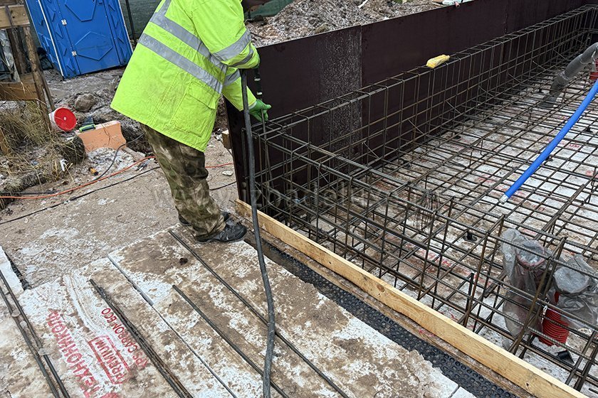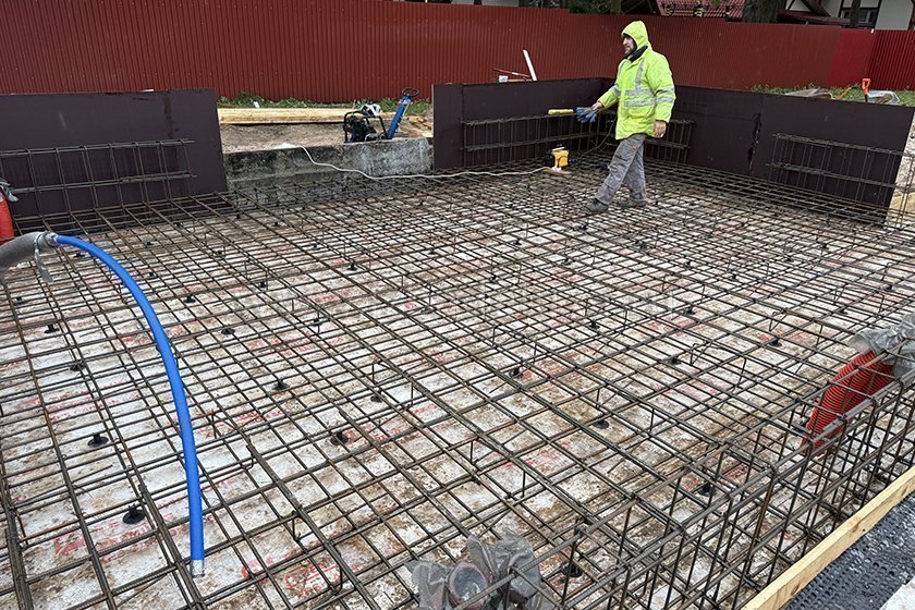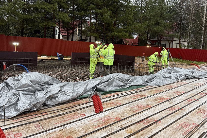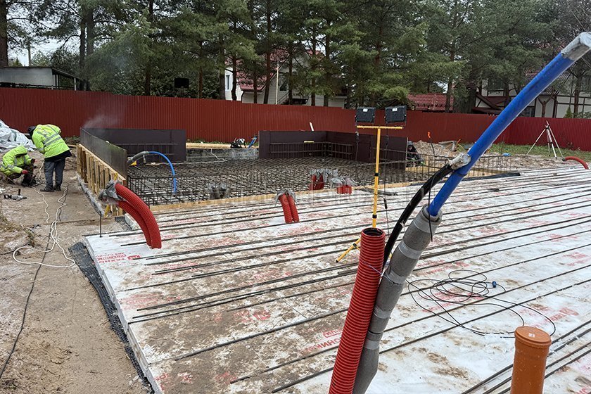 На объекте выполняются работы по армированию плиты фундамента.