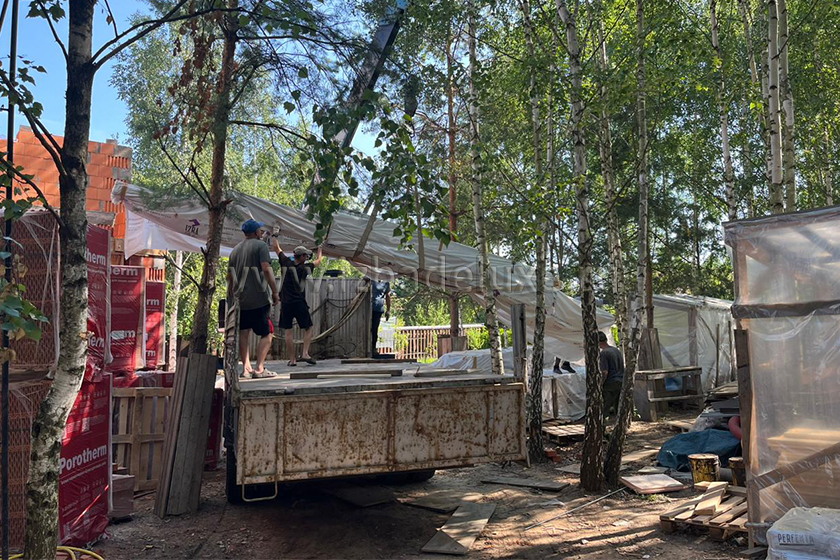 2. Организация подъездных путей - укладка ЖБ-плит для проезда техники. ЖБ-плиты облегчают проезд техники, не портят грунт. В конце стройки их можно использовать для въездной группы или продать как б/у.